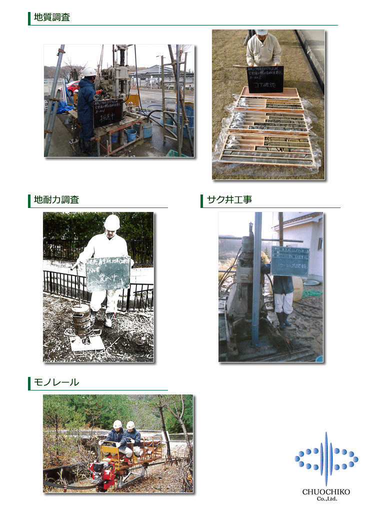 | ◇地質調査 ◇地耐力調査 ◇土質調査 ◇環境調査 ◇サク井工事 ◇モノレール設置 |